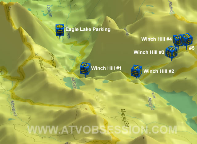 These are some of the trails we've taken. All waypoints and Trail Tracks were taken using a Magellan Sport Trak Pro GPS. All 2D and 3D Map shots were used using Magellan Mapsend Topo 3D. Earth shots are used using Google Earth Plus. |