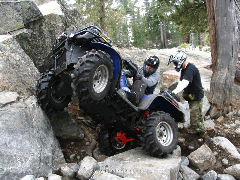 Last weekend 8 of the ATV Obsession gang went from Loon Lake to Buck Island Lake, setup camp, then rode to the Rubicon Springs and back to Buck Island Lake in one day. The next day we did the Rubicon backwards, back to Loon Lake. We had an awesome time, but also some scary moments as 6 of the ATV's rolled over and one guy...Larry, drove off the trail and had to be winched back onto the road. It was a treacherous trail, but nobody was hurt. One of the members, Dan is 60 years young and one our members is my wife. You don't see many guys out there doing this...and you certainly don't see many females rock crawling. We venture to bet the list of women that have rode an ATV frontwards and Backwards through the Rubicon is a pretty small list. Check out the photo and video section for 124 awesome pictures! I have it setup on Slide Show mode...use the Stop/Start anytime you want. |