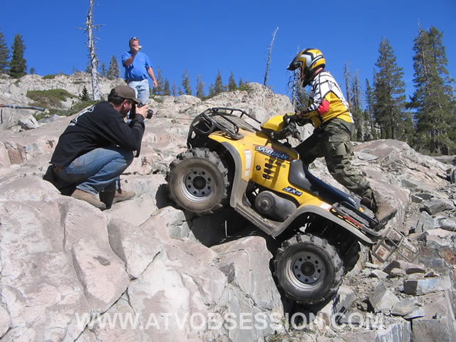 The first annual Mr. Miyagi Memorial ride is a wrap! What great fun, incredible/insane riding and a fitting tribute to Terry Reid..aka Mr. Miyagi. We covered 3 campsites and 15 or so people over 4 days at Meadow Lake. What an awesome weekend. We had freezing cold nights, snow and beautiful sunny warm weather all in 24 hours! The highlight of the riding was Thomas Opre, from Tahoe Films, who flew out from Montana to film us rock crawling for his next video, Mountains and Mud II. We took Thomas all over the Fordyce area and filmed in several locations along the trail. On Friday evening, we watched Mountains and Mud I. On Saturday night, about 10 of us crowded around the fire and watched Sled Heads II. I highly recommend both DVD's! Sled Heads 2 has the most insane opening sequence and 60 minutes of just unreal scenery, that is just beautifully shot. Here's a shot of Thomas shooting me going up this ridiculous rock face....