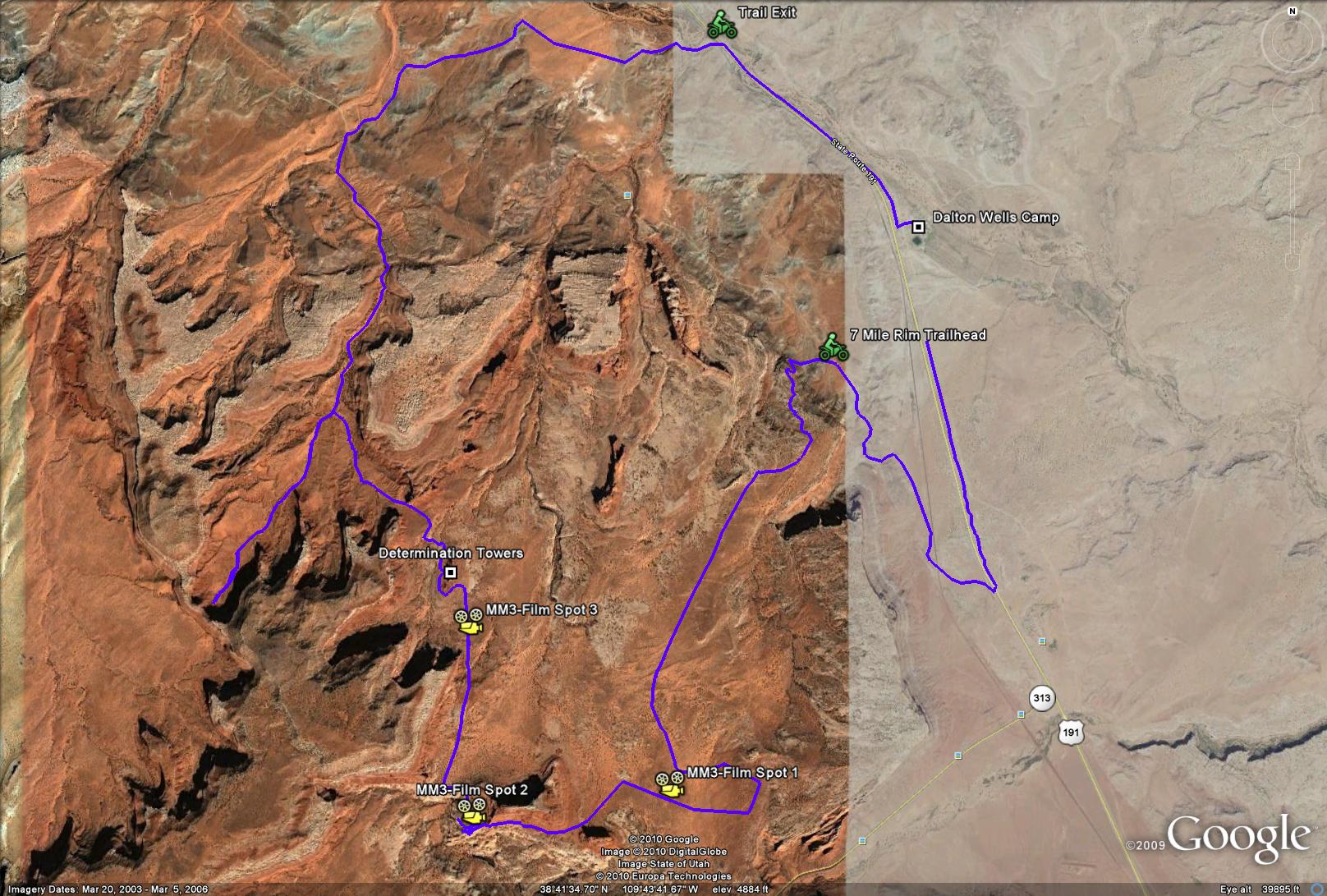 Description: Moab Rim on a quad or full-size, will scare the crap out of you in spots. There are few difficult obstacles with no bypasses. But the view at the end of the rim, is spectacular. The KMZ contains our tracks from 2010. |