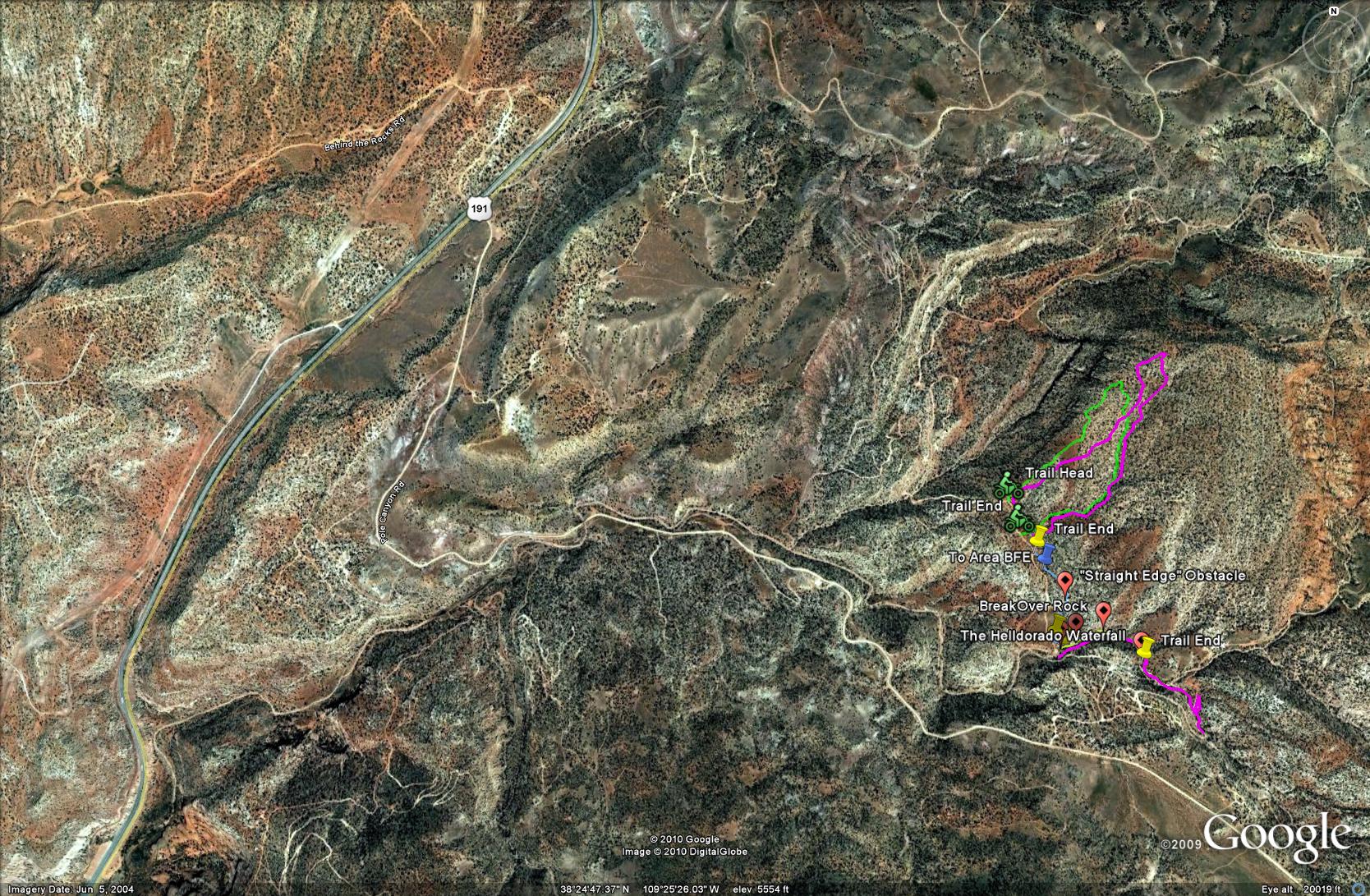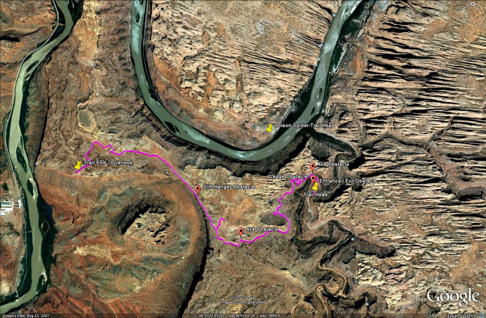 Description: Metal Masher. One of my favorites. It has 2 extreme obstacles, Rock Chucker and Widowmaker. However, both of them have bypasses, making this trail intermediate overall. It has a great view in the middle overlooking 191, and after you finish you're a short ride to Gemini Bridges. The KMZ contains our tracks from 2007 and 2010. |