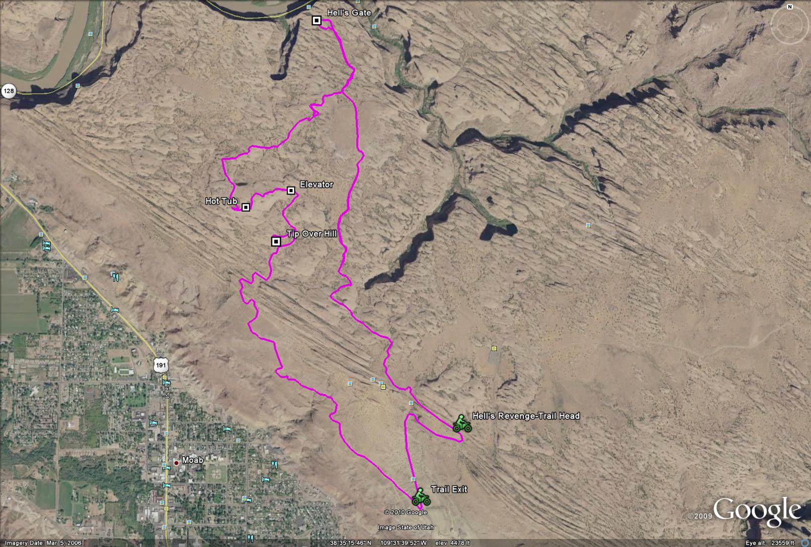 Description: Hell's Revenge is AMAZING. It is one of the most beautiful and quintessential trails in Moab. It is overall, fairly easy but you have to stay on your toes, as one false turn on an "easy" section and you will die. The trail crosses several times the famouns Slick Rock Bike/Motorcycle trail. Overall, there aren't any mandatory difficult sections. However, for the daring you can attempt Hell's Gate, but be aware that one false move and you won't like it. Jack and I both went up Hell's Gate on our ATV's, but I wouldn't recommend it unless you are REALLY sure of your ability and willing to lose your ATV. The KMZ contains our tracks from 2010. |