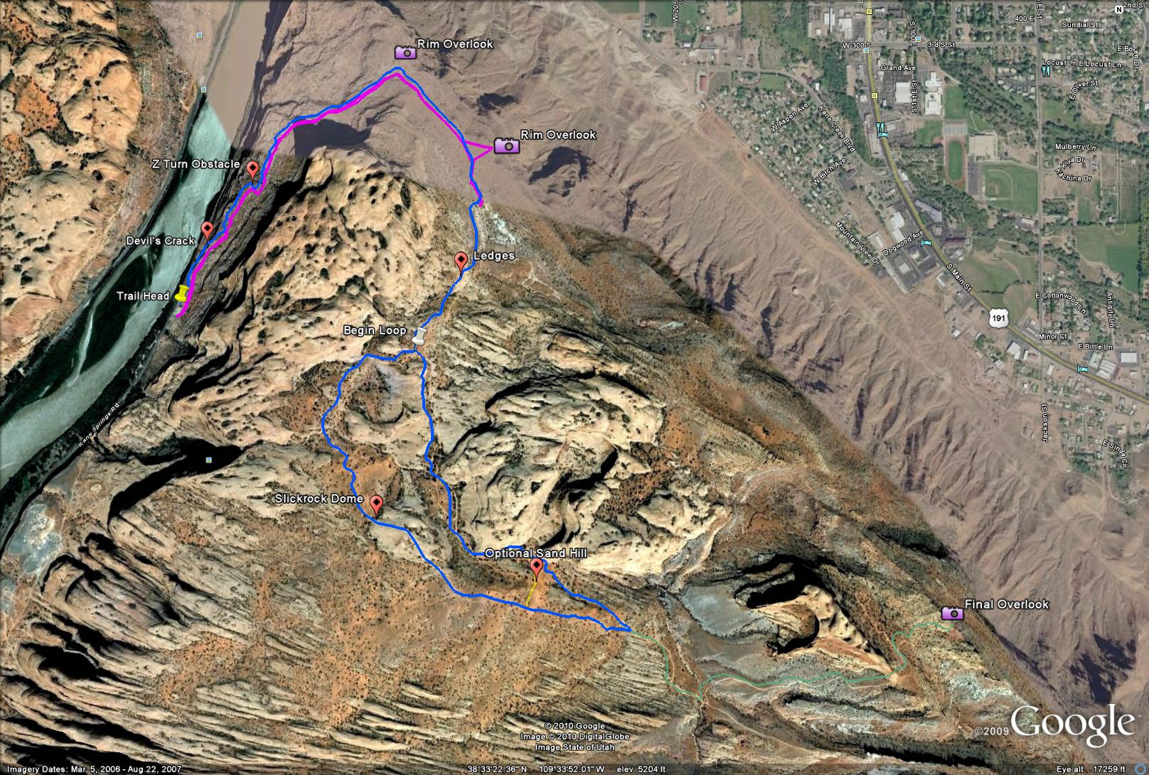 Description: Behind The Rock is a very long, and difficult trail. We have never done the trail, so I can't tell you how difficult or bypasses, but it is is rated 4+ in many books (out of 5). You can connect with Pritchett Canyon and Kane Creek Rim trail...not the same as Kane Creek Canyon. The KMZ does not contain our tracks. |